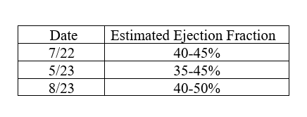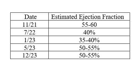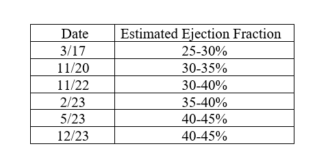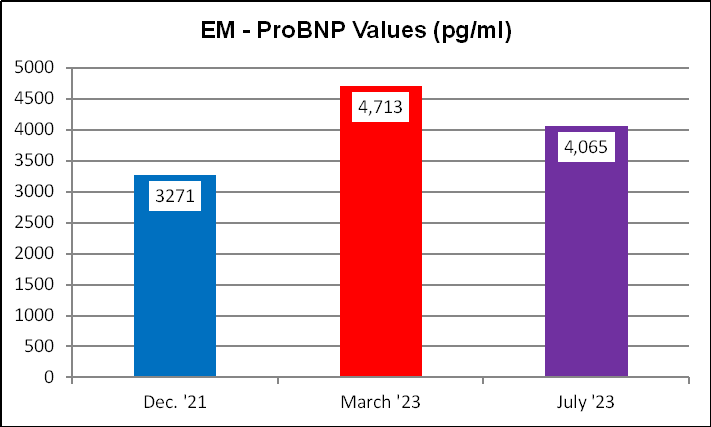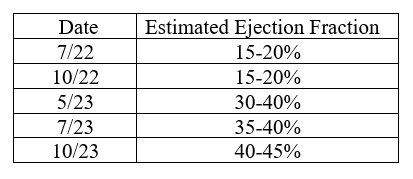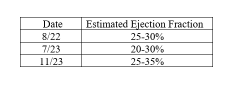 JM continued to struggle, with a pro-BNP of 15,272 in 8/22. Echo study in 10/22 revealed persistent pump dysfunction, with an EF still in the 15-20% range. Side-effects of Jardiance led to its discontinuation.