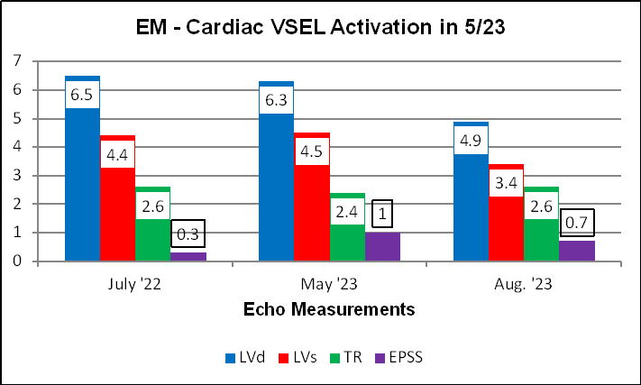 Cardiac VSEL activation was carried out on 5/5/23. Repeat echo three months later demonstrated a slightly improved EF (40-50%), a decrease in LV dimensions (6.3/4.5 to 4.9/3.4) and pro-BNP had dropped from 4,713 to 4,065.
