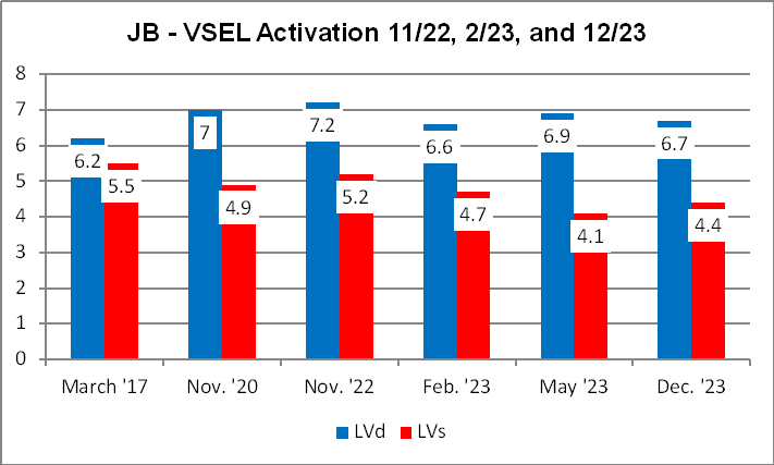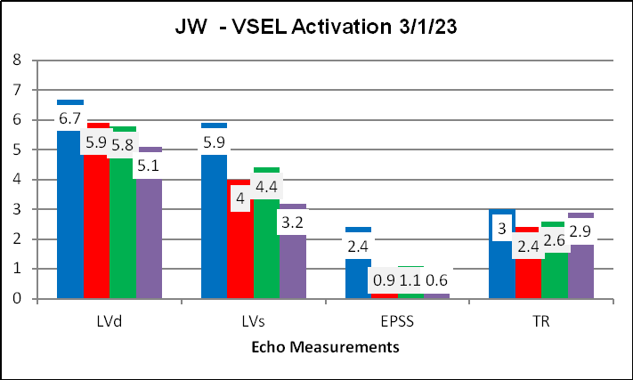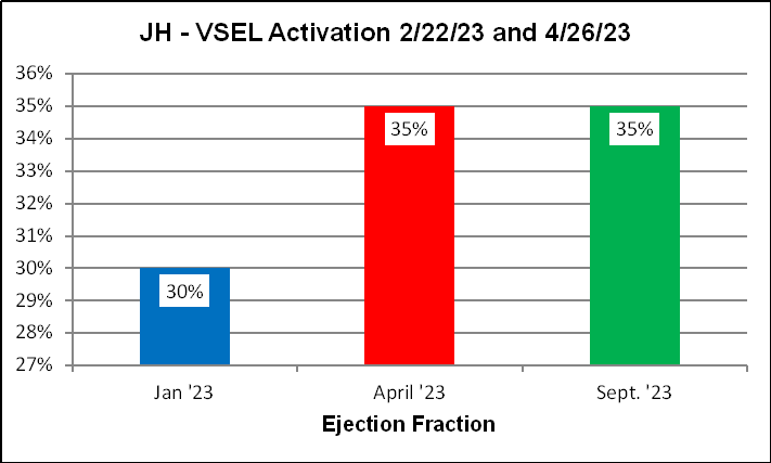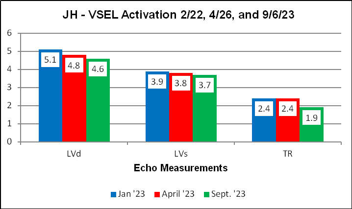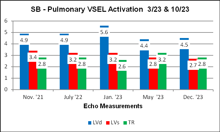 Thus we had maxed out the therapies that I was aware of. Prior to VSEL activation in 11/22, JB' LV diastolic dimension (LVd) had been trending up, while the systolic dimension (LVs) was stable to improved. 2-3 months post VSEL activation, in 2/23, JB noted a slight improvement in stamina when climbing stairs. His EF was a little better, then in the 35-40% range, and his LV dimensions had decreased from 7.2/4.9 to 6.6/4.7. We thus repeated the procedure on 2/23 and again in late 12/23. Jardiance was stopped in the fall of '23 (insurance co-pay rose ridiculously), and with this pro-BNP (different reference range vs. the standard BNP) rose from 1909 to 2099. His LVs has increased, but remains improved vs. the pre-VSEL baseline. JB remains essentially asymptomatic.
