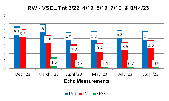 RW underwent VSEL activation on 3/22/23, and began the corresponding Gematria CV supplements (Systema, Methusalife, Complete Aminos, Heart Gems, Recharge, and Mag Spectrum). Echo study carried out on 4/19/23, at the time of RW's second VSEL activation, showed obvious interval improvement. I graded RW's EF at 30% and felt that regional enlargement in the LAD distribution was less obvious. LV dimensions were further decreased (a good sign), as was the EPSS (a marker of pump dysfunction if above 1.0 cm). Eager to avoid the need for defibrillator placement RW began a program of monthly VSEL activation. Non-pharmaceutical lipid -lowering therapy was initiated, and with this RW's LDL decreased from 196 to 128 mg/dl, and RW completed two months of Cavadex (to pull lipids our of the artery wall and back to the liver). RW's echo studies continue to demonstrate improvement. To my eye, the LAD distribution itself has not come back, but function at the edges of the infarct (heart attack zone) have improved. ST segment elevation (a sign of acute heart attack and later aneurysm formation) has also decreased.