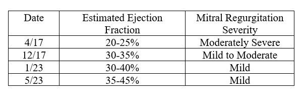 TC remained clinically compensated, with an EF in the 25-30% range, between 4/19 and 8/22, but in 7/23, we noted a slip in pump function, with an EF of 20-30% and an increase in LV dimensions..